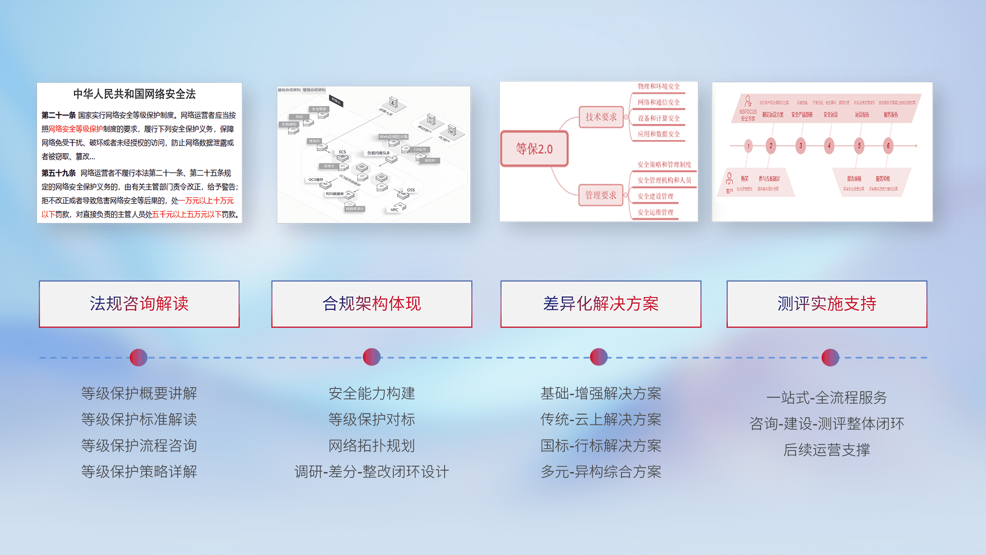 通过专业的法律咨询解读、、合规架构体现、、、、差异化解决方案、、、测试实施支持等服务,,,为客户量身打造等保合规体系。。。